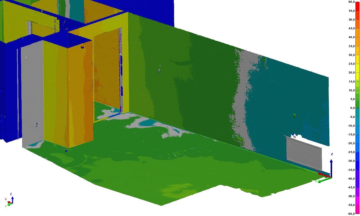 The acquired data serves as reference for the comparison between as-built situation and the CAD of the planned project. Thereby the previously optimized point cloud is fitted to the location according to the project drawing. If both data sets are placed optimally on each other, the distance between nominal and actual is calculated over the entire area and the deviations are displayed coloured. Critical areas can be quickly identified and reported.